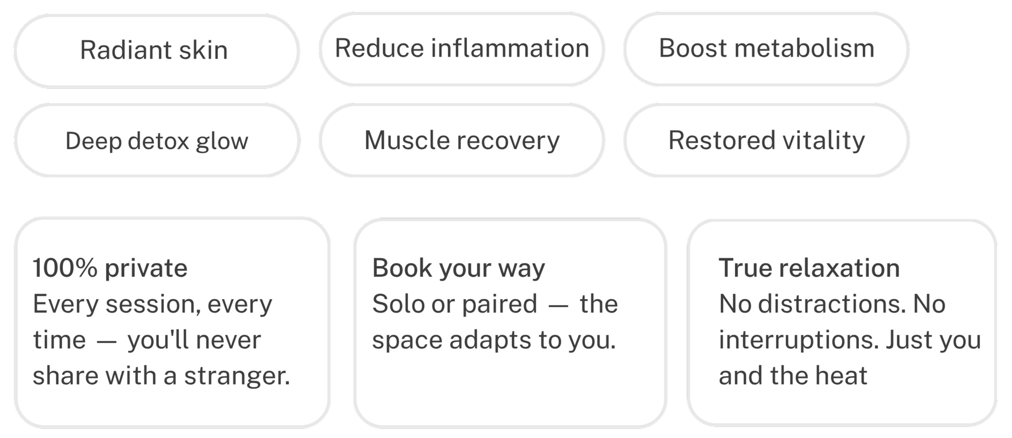 And every session is completely private. Just you and the heat, from the moment you step in to the moment you leave feeling luminous.